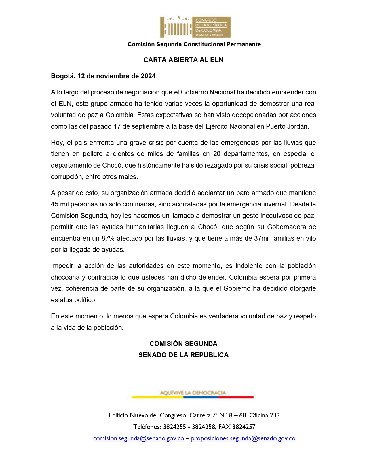 Comunicado de prensa carta abierta al ELN