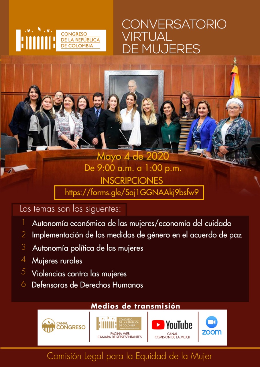 El evento virtual será transmitido por el Canal Congreso, la página web de la Cámara de Representantes, canal Youtube de la Comisión de la Mujer y la plataforma Zoom.