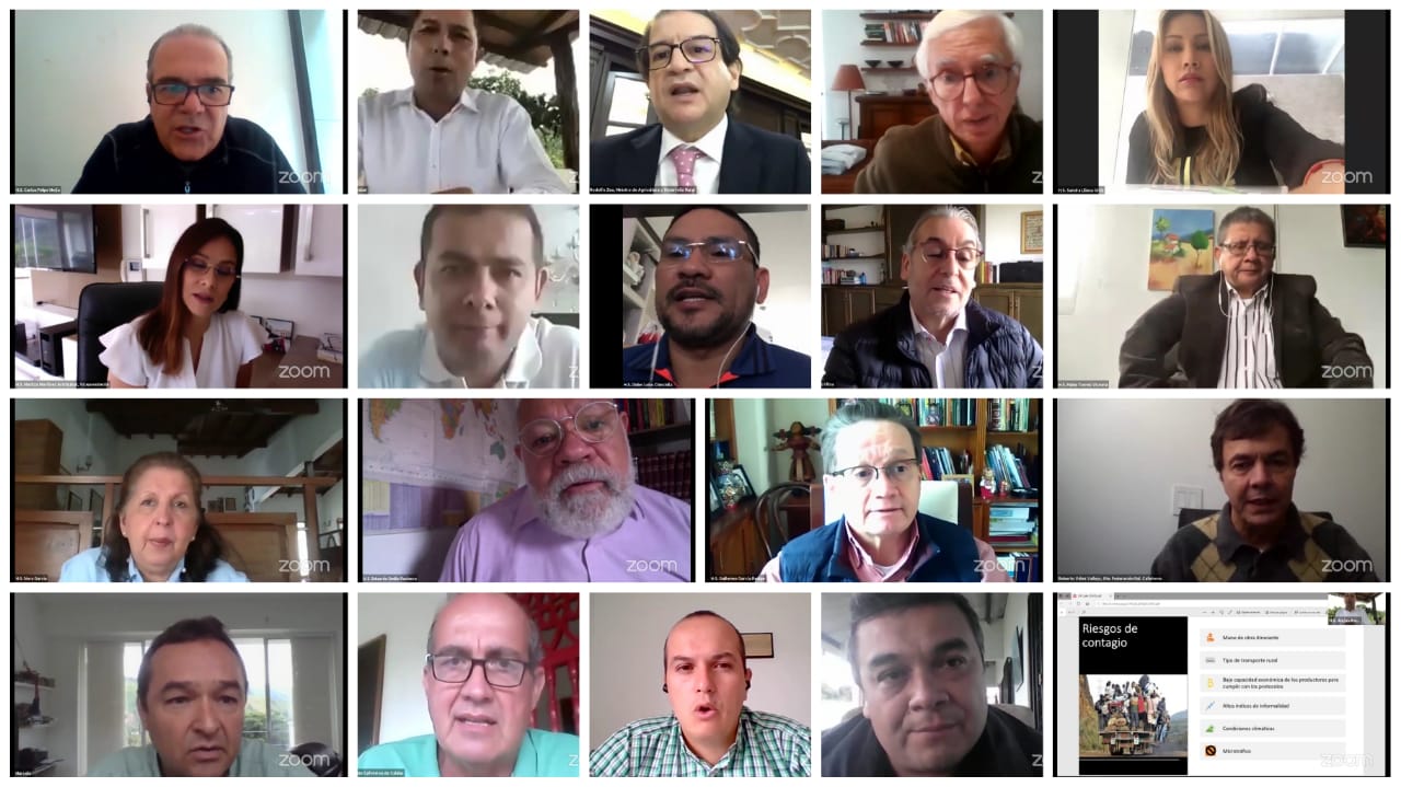 En la sesión virtual participaron Rodolfo Zea, ministro de Agricultura; Roberto Vélez, gerente de la Federación Nacional de Cafeteros; Eliécer Sierra, representante de Antioquia en el Comité Nacional de Cafeteros; Marcelo Salazar, dirigente cafetero del departamento de Caldas; Sebastián Muñoz, miembro de la Compañía Cafetera La Meseta; Eugenio Vélez, representante de los cafeteros del departamento de Caldas; Luis Ramírez, miembro del Comité Nacional de Cafeteros; César Echeverry, director de Supercafé; Gildardo Monroy, director ejecutivo del comité de cafeteros del departamento del Tolima; Ruber Bustos, delegado del Comité de Cafeteros del Huila y Víctor Cajiao, campesino caficultor.
