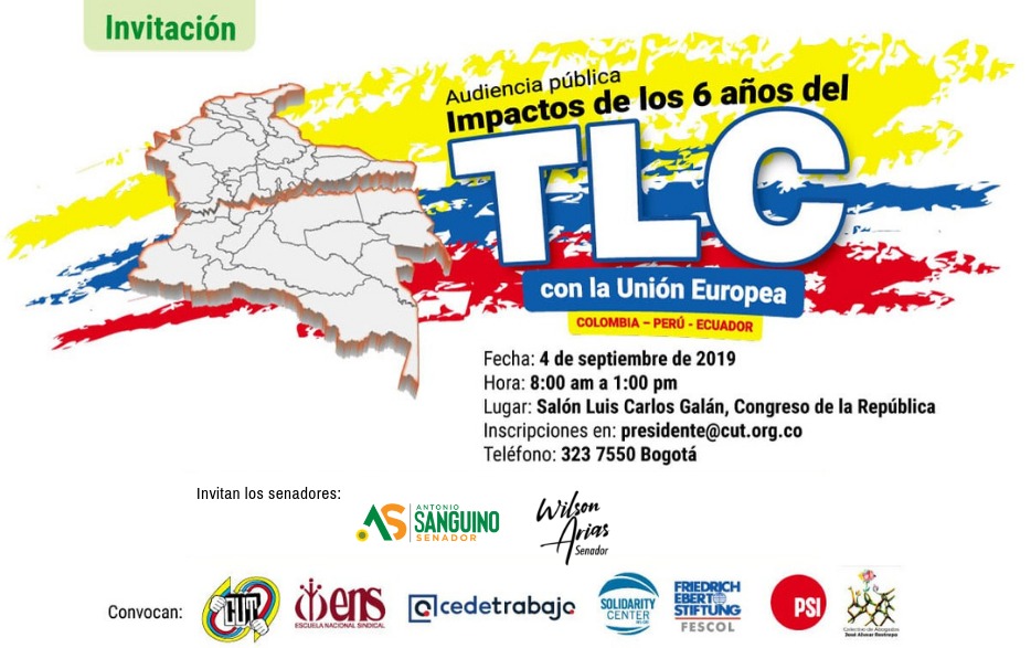 Bogotá, septiembre 3 de 2019 (Prensa s. Wilson Arias - s. Antonio Sanguino).- Citada por la Comisión Segunda del Senado, convocada por el senador Antonio Sanguino y el senador Wilson Arias, y con el apoyo de la Central Unitaria de Trabajadores – CUT y organizaciones sociales y académicas, se realizará una Audiencia Pública en el Congreso de la República, para monitorear los impactos en materia comercial, laboral, ambiental y de Derechos Humanos, de los seis años de vigencia del Tratado de Libre Comercio de Colombia con la Unión Europea, Perú y Ecuador.