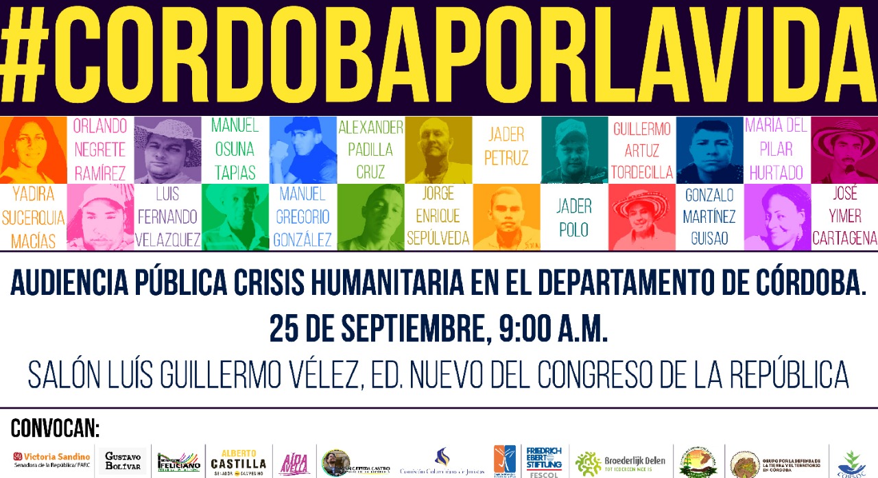 Bogotá D.C., septiembre 23 de 2109.- Las senadoras y senadores Victoria Sandino, Aida Avella, Iván Cepeda, Gustavo Bolívar, Feliciano Valencia y Alberto Castilla, realizarán una Audiencia Pública sobre la Crisis Humanitaria en el sur del departamento de Córdoba.