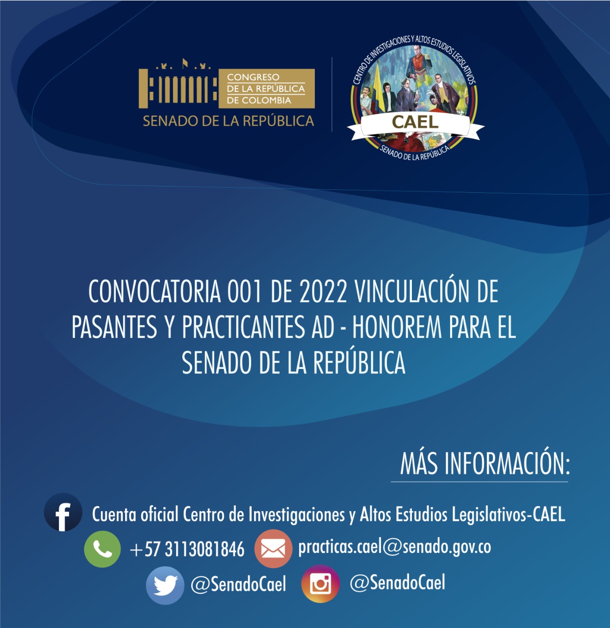 La Secretaría General del Senado y el Centro de Investigaciones y Altos Estudios Legislativos – CAEL, tiene dentro de sus procesos de formación académica, el fortalecimiento del talento humano del Congreso de la República que mediante los convenios interinstitucionales con la academia, convoca a estudiantes de últimos semestres a realizar sus pasantías ad – honorem en el Legislativo.
