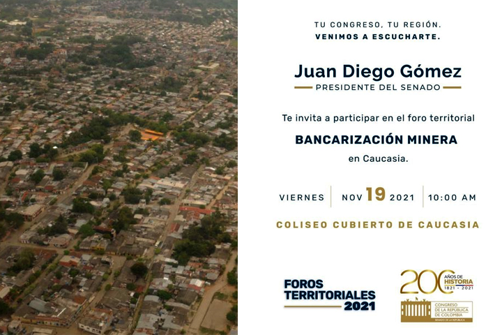 Bogotá D.C., noviembre 17 de 2021 (Prensa Senado).- El presidente del Senado Juan Diego Gómez, del Partido Conservador, en su compromiso de escuchar y acercar a la ciudadanía con el Estado retoma la estrategia Foros territoriales “Tu Congreso, tu región, venimos a escucharte”, esta vez con el fin de abordar el tema de Bancarización Minera en Caucasia, Antioquia, evento que será llevado a cabo en el Coliseo Cubierto del municipio.