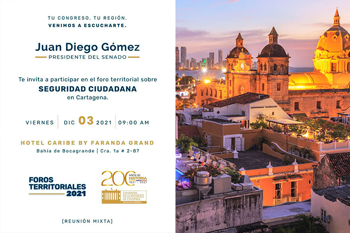 Bogotá D.C., diciembre 2 de 2021 (Prensa Senado). El presidente del Senado Juan Diego Gómez Jiménez, del Partido Conservador, en su compromiso de escuchar y acercar a la ciudadanía con el legislativo realiza su octavo Foro territorial “Tu Congreso, tu región, venimos a escucharte”, esta vez con el fin de abordar el tema de seguridad ciudadana en Cartagena, tendrá lugar en las instalaciones del hotel Caribe by Faranda Grand.