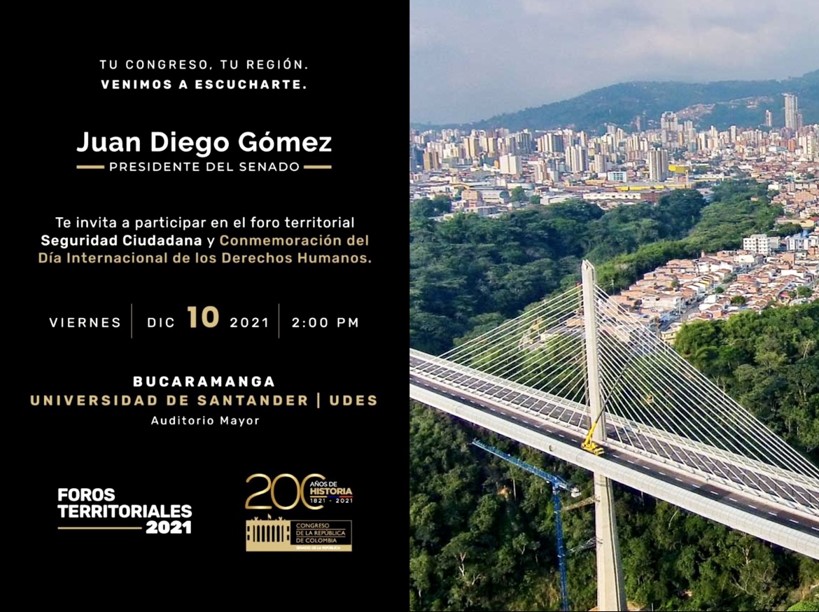Bogotá D.C., diciembre 9 de 2021 (Prensa Senado). El presidente del Senado Juan Diego Gómez Jiménez, del Partido Conservador, realiza el noveno Foro territorial “Tu Congreso, Tu región, venimos a escucharte”, con el fin de abordar el tema de seguridad ciudadana y conmemorar el día internacional de los Derechos Humanos, el evento se llevará a cabo en la ciudad de Bucaramanga en la universidad de Santander, UDES.