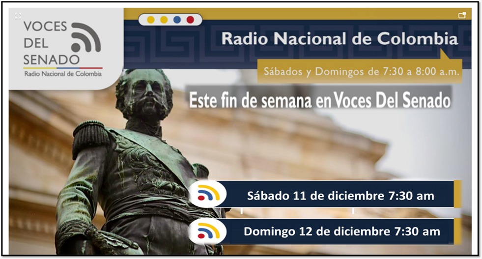 Este programa, se transmite por las 53 frecuencias de la Radio Nacional de Colombia, los días sábados y domingos de 7:30 am a 8:00 am, además nos encuentran en nuestras redes sociales de Facebook (senado Colombia), Twitter e Instagram (@senado.gov.co), YouTube (voces del senado) y en nuestra aplicación (mi senado).