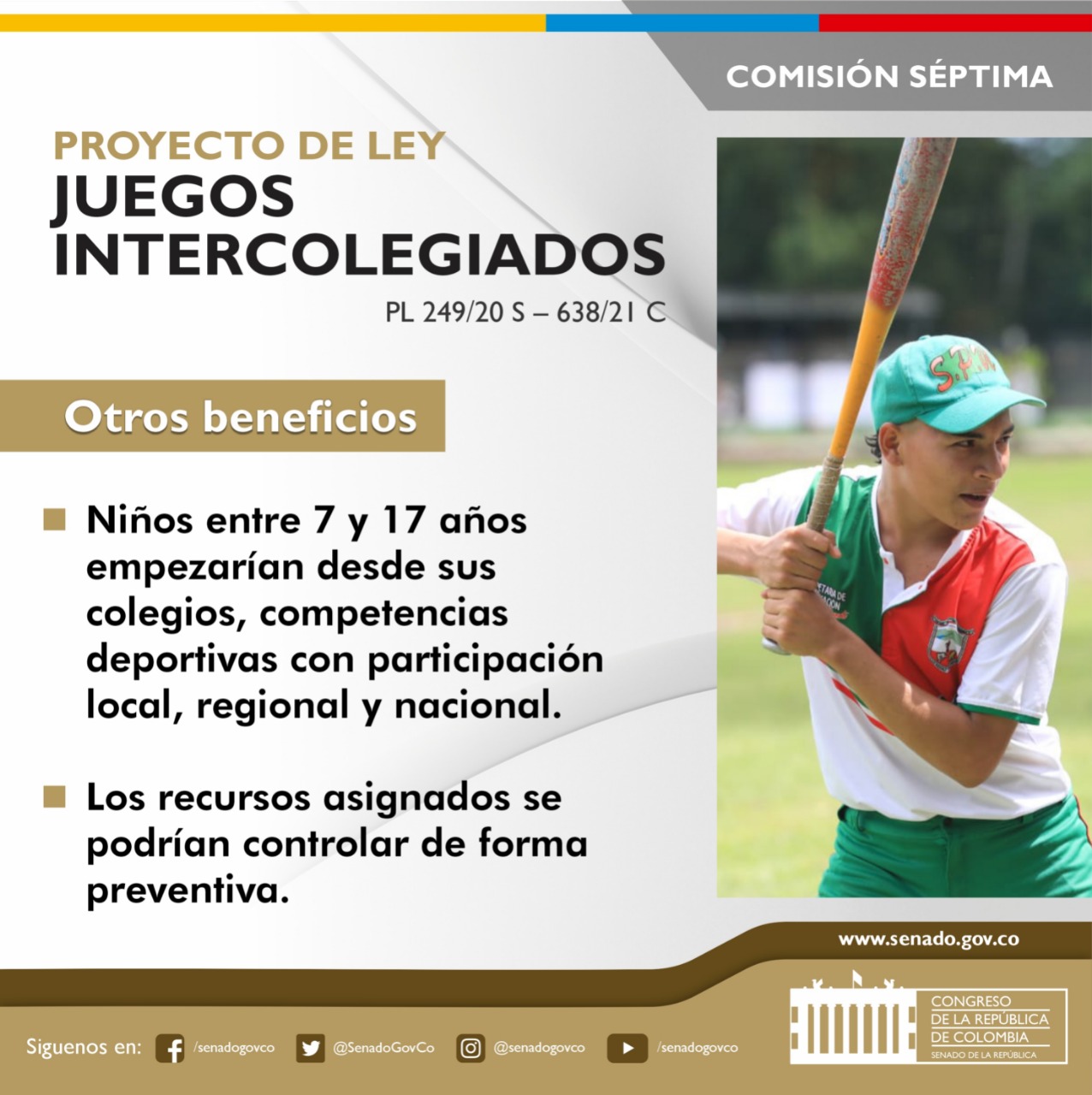 Esta iniciativa –que ya hizo el tránsito legislativo por la comisión Séptima, de Senado; por la plenaria de Senado; y por la comisión séptima de Cámara- tiene por objeto establecer las disposiciones sobre los Juegos Intercolegiados Nacionales, “de sus procesos de organización y realización de las competencias deportivas, responsabilidades y alcance en sus fases intercursos, municipal, zonales departamentales, finales departamentales, regionales nacionales, final nacional y participación internacional; y garantizar la destinación y ejecución de los recursos”.