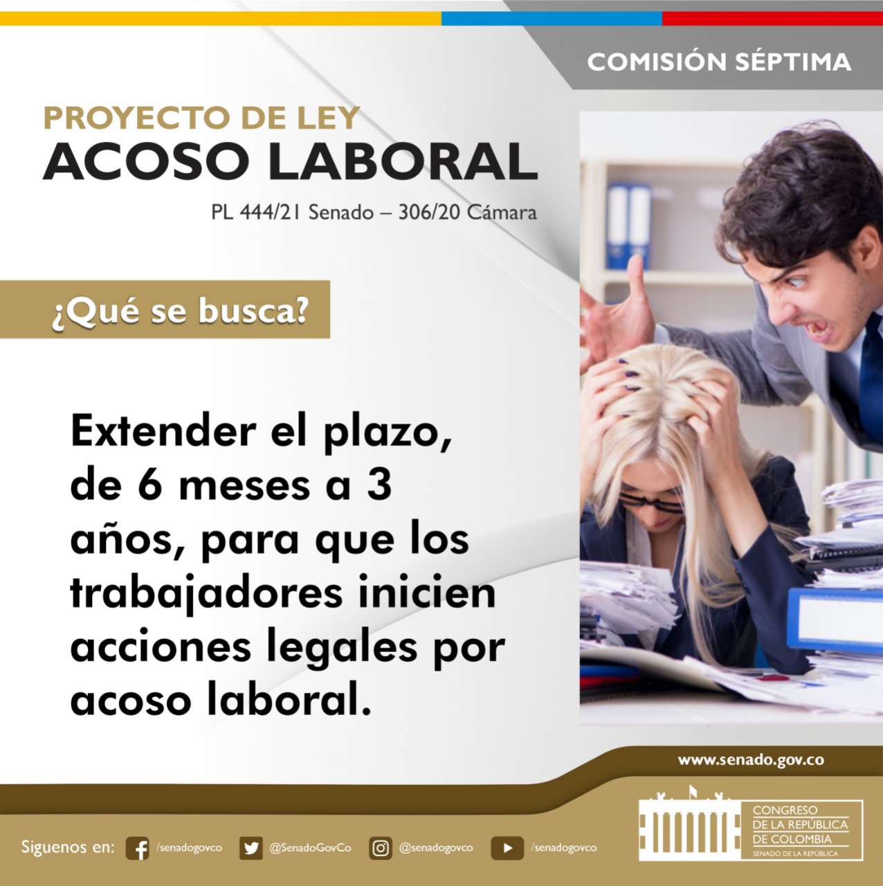 Aunque la Ley 1010 de 2006 normativiza la corrección, prevención y sanción de las conductas de acoso laboral, sin embargo, el proyecto señala que, “los trabajadores que han sufrido estas conductas en sus ambientes laborales poco acceden a la justicia”; de ahí la necesidad de ampliar de seis meses a tres años, el plazo para denunciar.