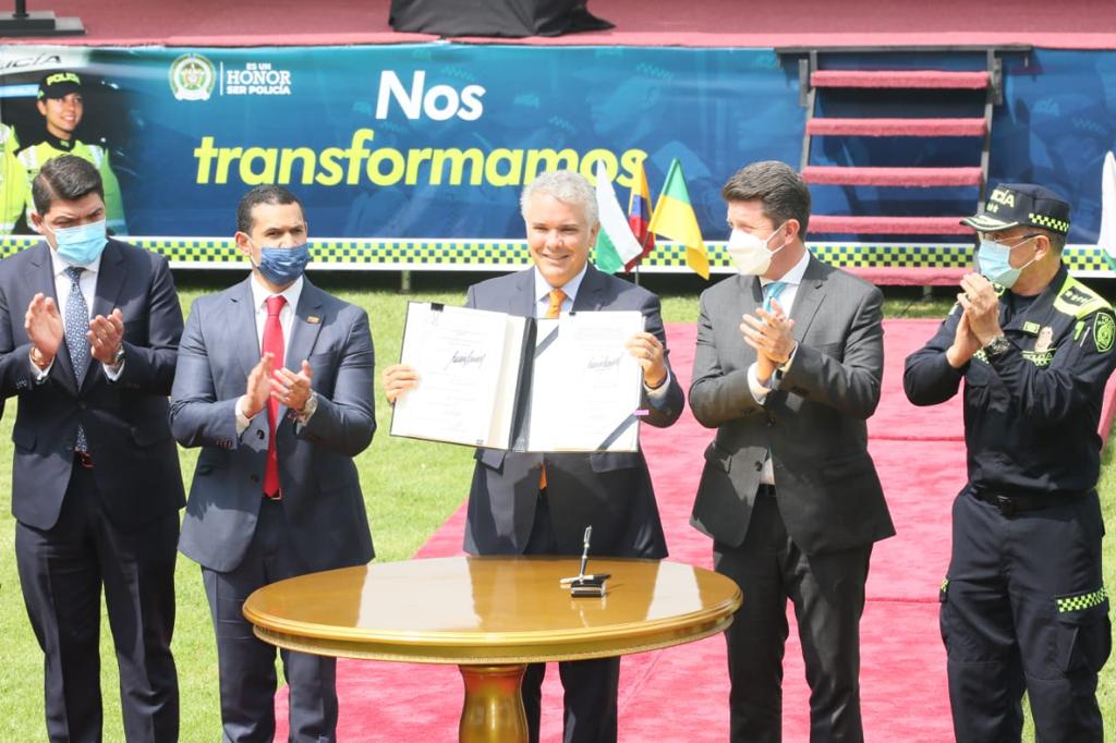 “Estos proyectos de ley que el presidente de la República sanciona hoy tienen una particularidad, fueron proyectos de ley radicados el pasado 19 de julio del 2021 por los Ministerios del Interior y Defensa. En el Congreso se atendió su mensaje de urgencia como correspondía y contaron, en un acto democrático, con seis ponentes y 52 coautores, que involucró a todas las fuerzas políticas”, sostuvo el dignatario del Senado.