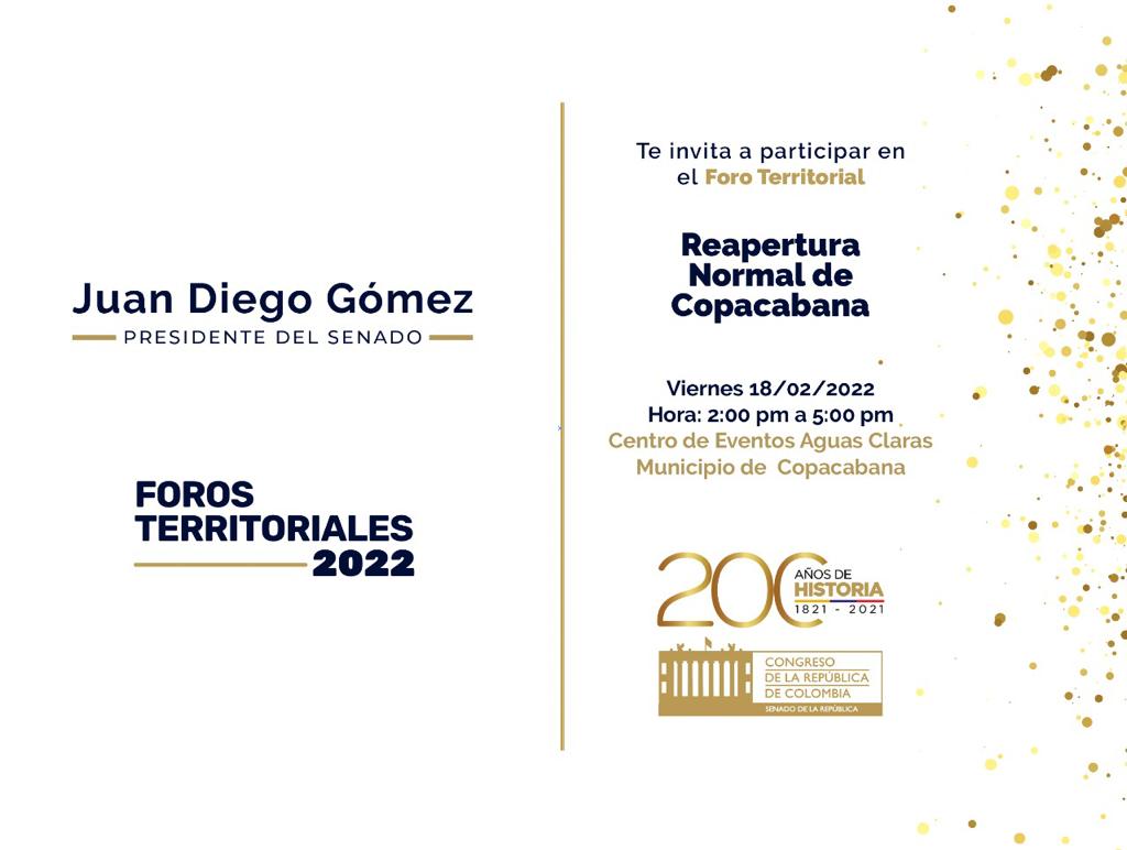 Bogotá D.C., febrero 17 de 2022 (Prensa Senado). Este viernes, el presidente del Senado, Juan Diego Gómez, siguiendo con su compromiso de escuchar y acercar al Estado a la ciudadanía, continua con los foros territoriales “Tu Congreso, Tu Región, venimos a escucharte”, con el fin de abordar temas que afectan directamente a la ciudadanía para lo cual escuchará a las comunidades del municipio antioqueño de Copacabana, en el Centro de Eventos de Aguas Claras.