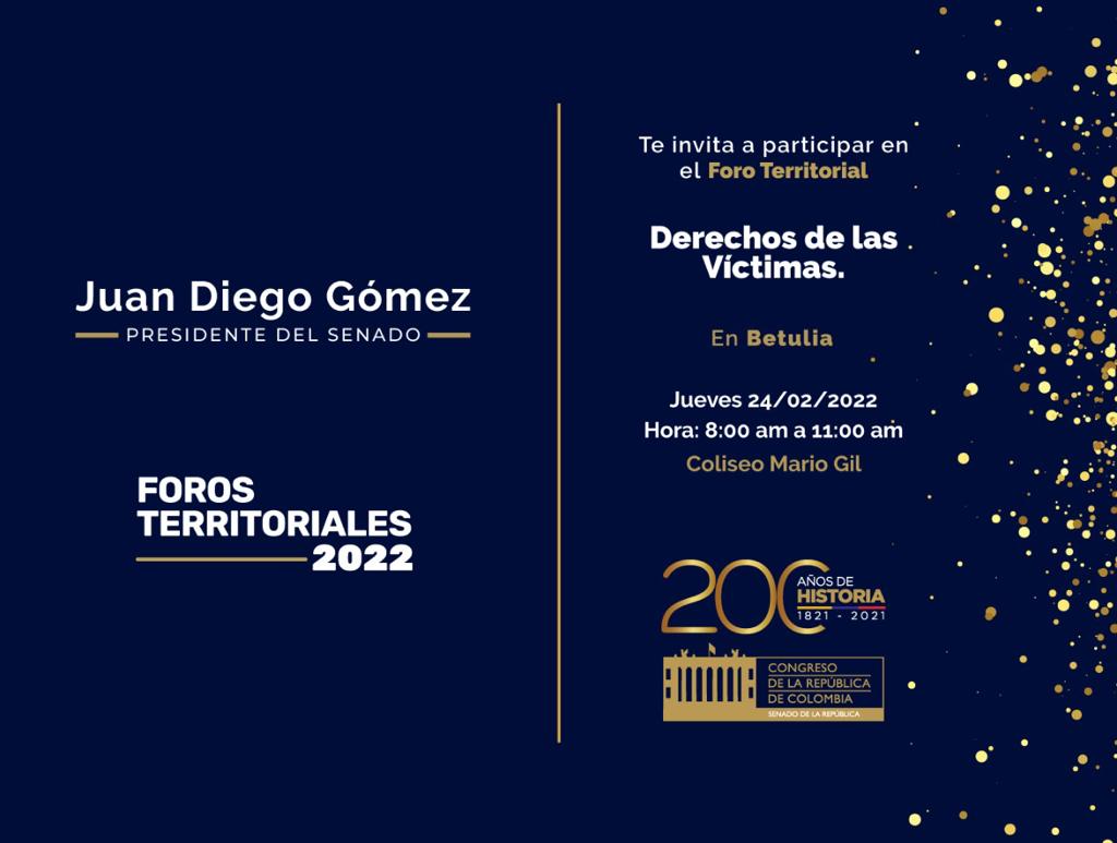 Este jueves 24 de febrero de 2022 a las 8:00 a.m. en el municipio antioqueño de Betulia, se llevará a cabo el próximo foro territorial perteneciente a la iniciativa “Tu Congreso, Tu región, venimos a escucharte”, encabezado por el presidente del Senado, Juan Diego Gómez.
