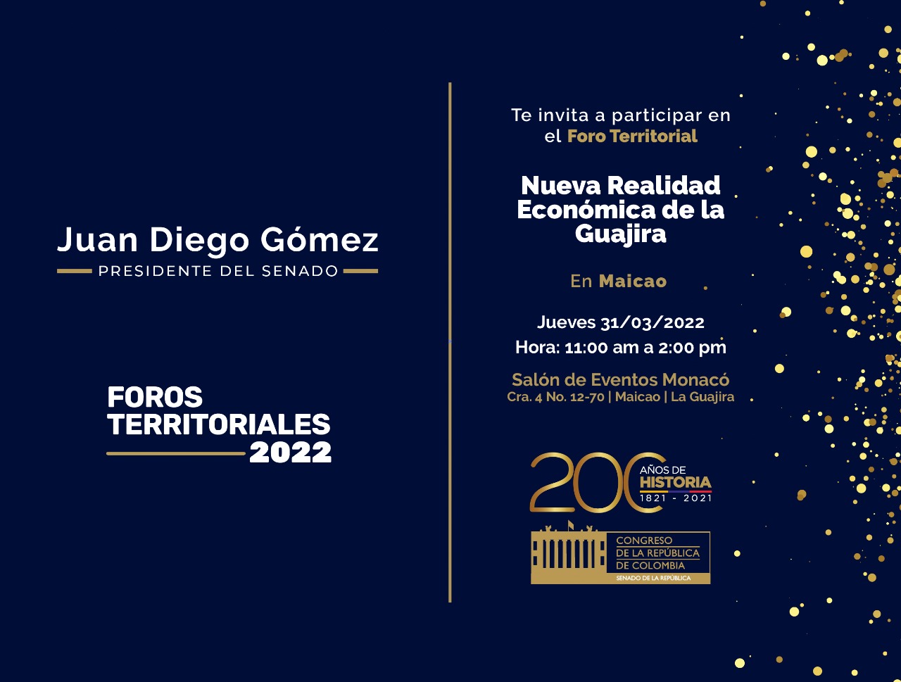 Bogotá D.C., marzo 28 de 2022 (Prensa Senado). Bogotá D.C., marzo 28 de 2022 (Prensa Senado). El presidente del Senado Juan Diego Gómez Jiménez, (Partido Conservador), llevará a cabo el Foro territorial “Tu Congreso, Tu Región, Venimos a Escucharte”, en la ciudad de Maicao (La Guajira), esta vez con el fin de llevar anuncio de buenas noticias a la región, después de haber escuchado a la ciudadanía y a las autoridades de la región sobre la nueva realidad económica del departamento, y las necesidades de actualizaciones en el marco reglamentario del régimen especial aduanero. Así mismo la promoción de Maicao, cómo el destino comercial que durante décadas lideró y que hoy quiere retomarse.