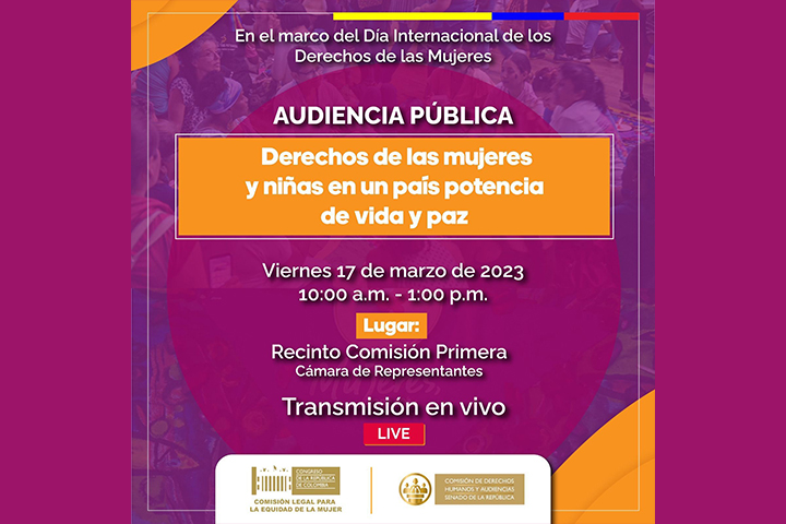 La Comisión de Derechos Humanos, presidida por la senadora Jahel Quiroga, y la Comisión Legal para la Equidad de la Mujer, encabezada por la senadora María José Pizarro, las y los invitan a la audiencia pública para hablar sobre los derechos de las mujeres como cimiento de una paz total con garantías. Recuerde registrarse en el siguiente link: https://bit.ly/3ZMScEm