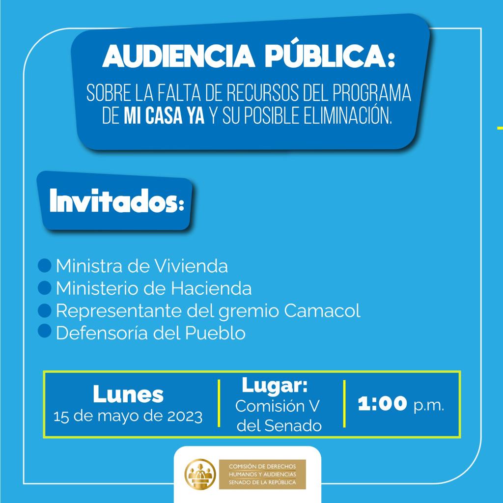 Bogotá. D.C., mayo 10 de 2023.- la Comisión de Derechos Humanos y Audiencias, invita a la ciudadanía a la audiencia pública, con el propósito de aclarar los alcance del programa "Mi Casa Ya".