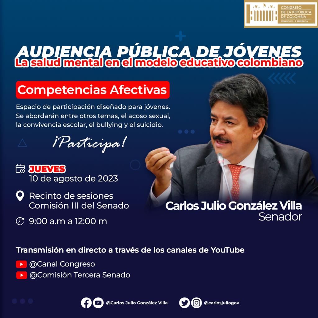 Bogotá, 9 de agosto de 2023. El psicólogo clínico y senador Carlos Julio González Villa lidera la audiencia pública para jóvenes sobre la salud mental en el modelo educativo colombiano. En esta oportunidad, la palabra la tendrán los invitados especiales para dialogar sobre sustancias psicoactivas, la convivencia escolar, el bullying, el suicidio, la depresión, entre otros temas.
