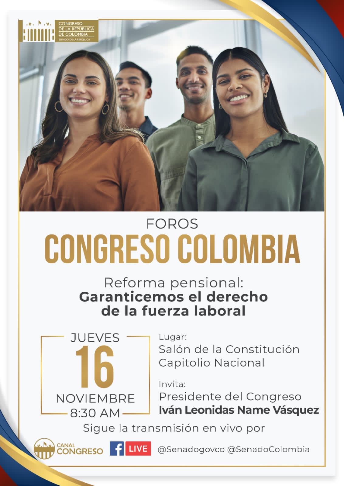 La presidencia del Senado hace la invitación a participar del foro Reforma Pensional, hoy, jueves 16 de noviembre a partir de las 8.30 a.m., en el Salón de la Constitución Capitolio Nacional, y será transmitido por el canal del Congreso y Facebook Live.