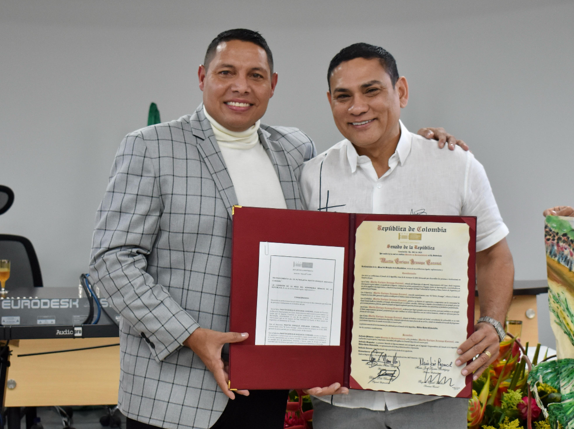 Becerril, 26 de enero de 2024. Este viernes, en el corazón de Becerril, un momento lleno de emoción y orgullo capturó la atención de todos. El honorable Senador Didier Lobo Chinchilla, en un gesto que honra la grandeza de su tierra, entregó una mención de reconocimiento del Congreso de la República a su paisano y referente del fútbol profesional: Martín Enrique Arzuaga Coronel.