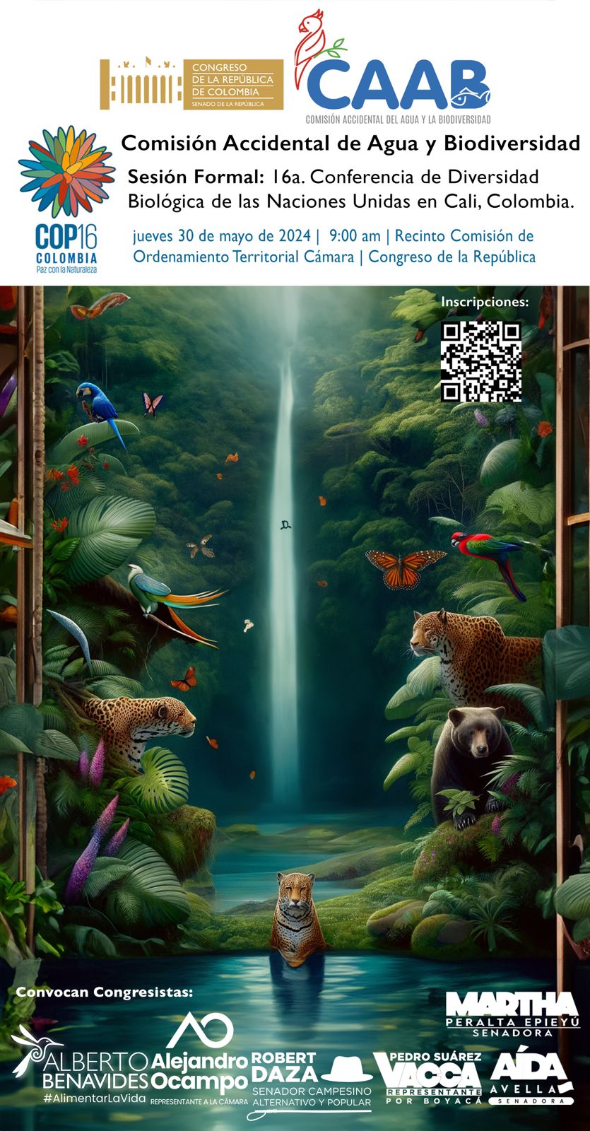 Bogotá D.C. mayo 29 de 2024.- La Comisión Accidental del Agua y Biodiversidad del Congreso de la República de Colombia hace extensiva invitación para su participación en nuestra sesión formal sobre la 16a. Conferencia sobre Diversidad Biológica a desarrollarse en Cali Colombia en octubre de 2024.