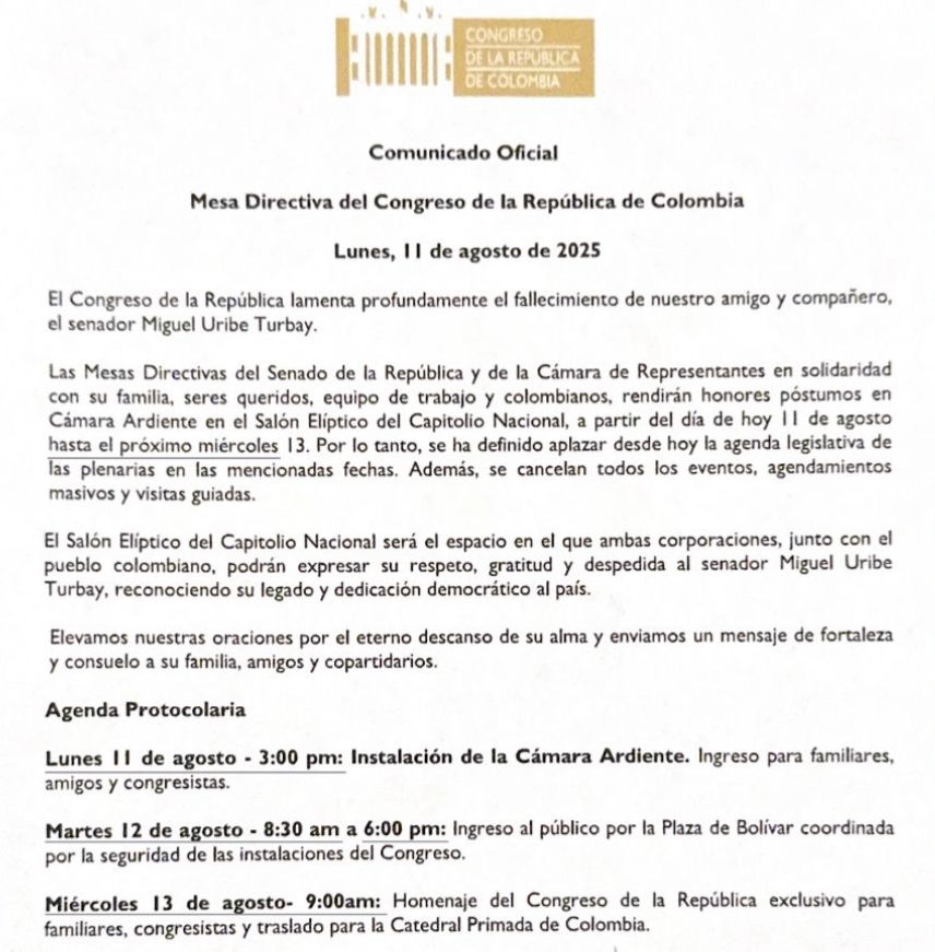 Comunicado oficial sobre Miguel Uribe