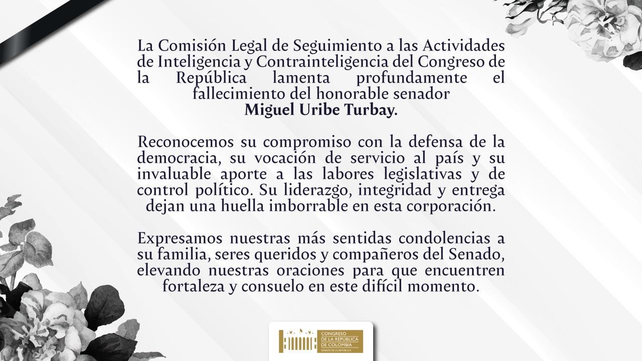 La Comisión Legal de Seguimiento a las Actividades de Inteligencia y Contrainteligencia del Congreso de la República expresó su profundo pesar por el fallecimiento del honorable senador Miguel Uribe Turbay.
