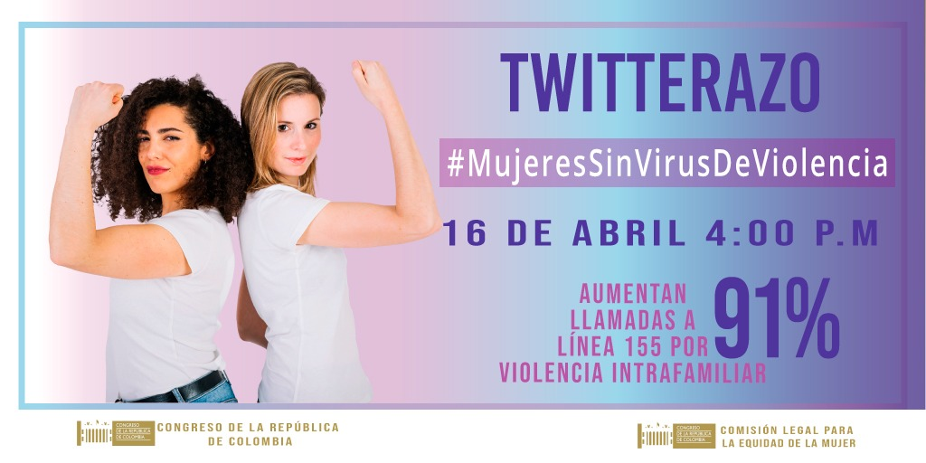Para el próximo jueves 16 de abril, a las 4:00 p.m. convocaron a través de la red social Twitter e Instagram a promover la campaña #MujeresSinVirusDeViolencia, tendiente a generar un compromiso solidario y de responsabilidad compartida para aunar esfuerzos en el derecho a una vida libre de violencias. La propuesta es volver tendencia esta causa que toca a todas y todos los colombianos.